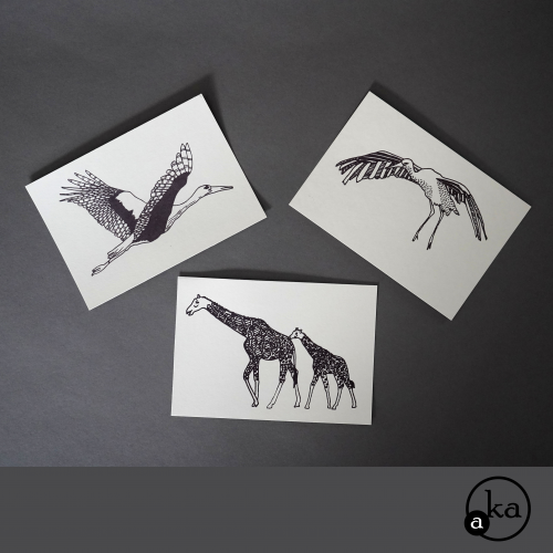 Cette série de cartes sérigraphiées est au format carte postale, 14.8×10.5cm, sur papier épais ivoire.